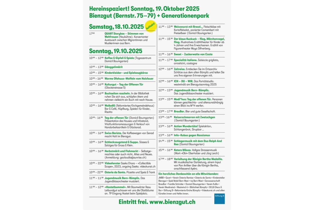 Captns illustrierte und gestaltet fortlaufend Flyer und Plakate für Veranstaltungen vom Bienzgut in Bümpliz. Das Bienzgut dient seit 1998 als Begegnungszentrum mit einem vielfältigen Angebot für Kinder, Jugendliche und Erwachsene. Im Bienzgut treffen sich Menschen am Flohmarkt, bei Familienfesten oder kulturellen Darbietungen, auf dem Spielplatz, beim Brotbacken oder in der Osteria da Santo. An zentraler Lage ist damit ein Treffpunkt für gesellschaftliche und kulturelle Kontakte und Aktivitäten entstanden. Gefragt ist zum Beispiel die Bibliothek, die mit gegen 20’000 Medien über eine stattliche Sammlung an Büchern und CDs verfügt. In der «Looslistube» schaut der «Philosoph von Bümpliz» kritisch auf Sitzungsteilnehmende. Im Gewölbekeller wird Bier gebraut und ausgeschenkt. Jugendliche erhalten in der ehemaligen «Söischür» Unterstützung von Fachkräften der Jugendarbeit Bern West, Obstbäume blühen auf der Weide, im Kinderatelier wir gezeichnet und gebastelt, dass die Späne fliegen.