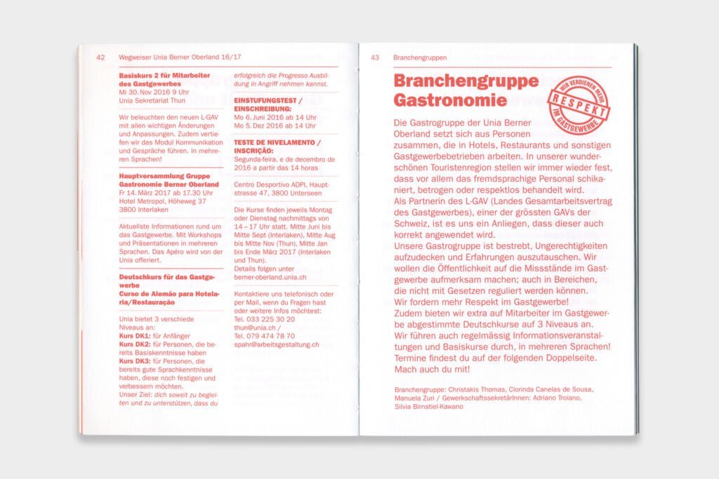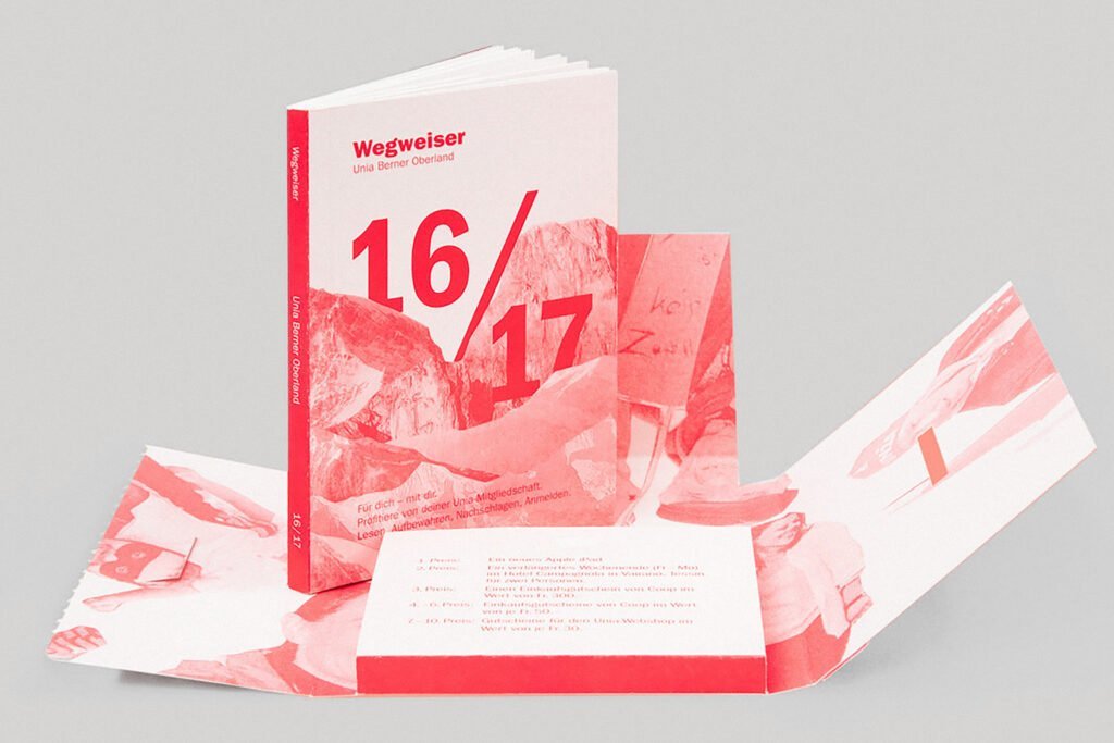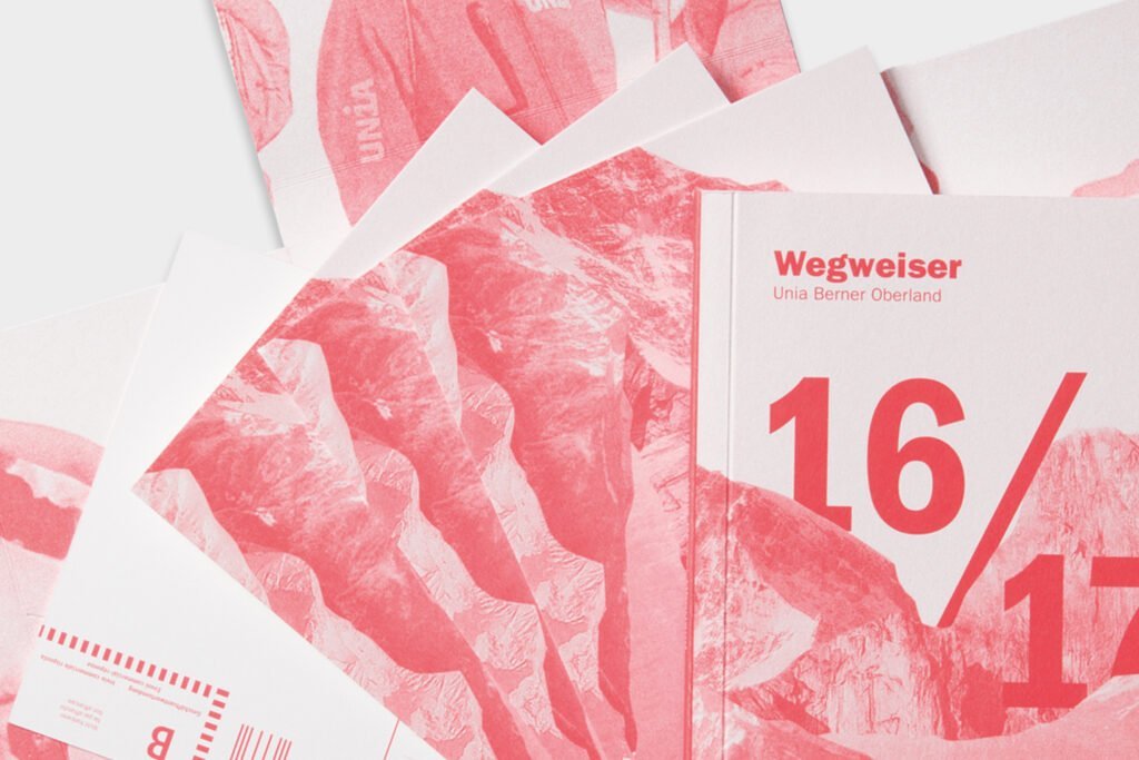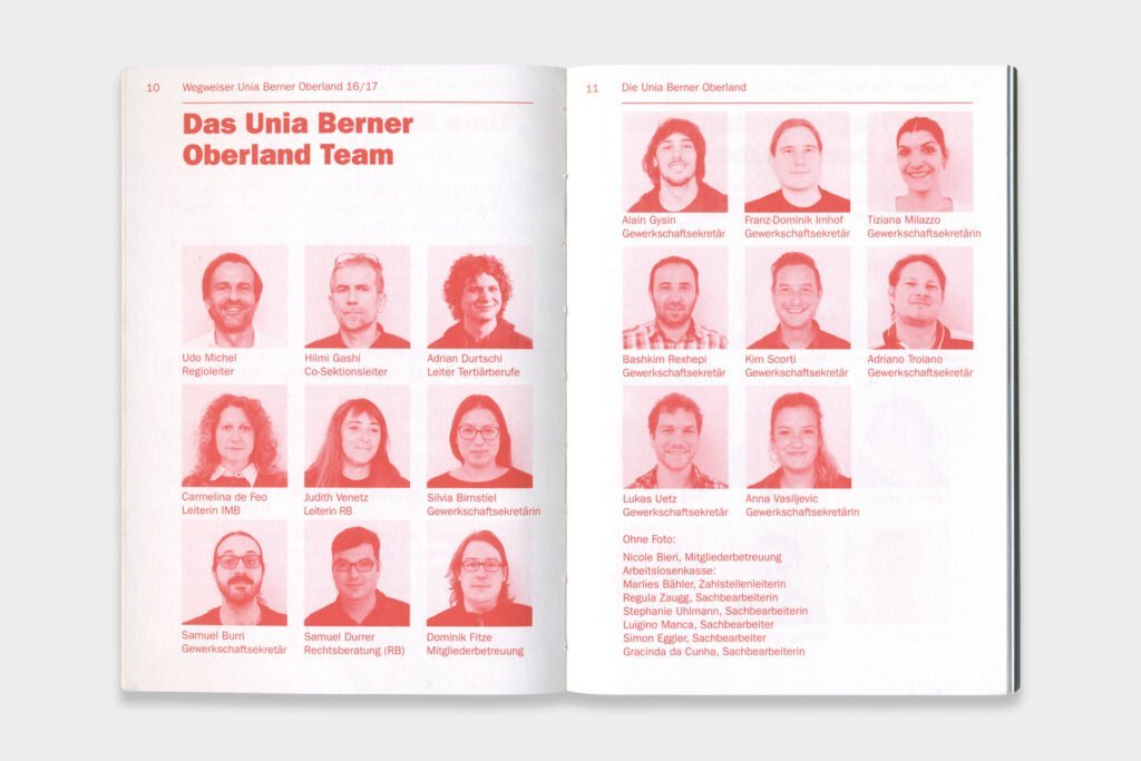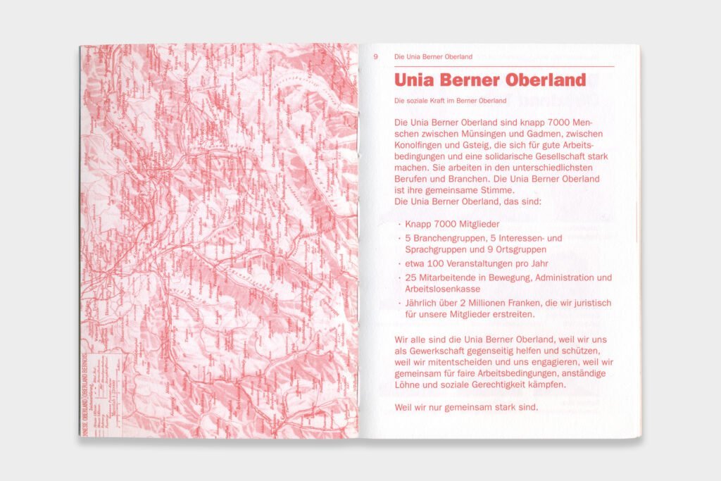 Captns gestaltete für die Unia Berner Oberland eine Agenda im handlich-kleinen Format. Diese stellt die Branchengruppen und ihre Anlässe in gesammelter Form vor. Die Agenda wurde in einer eigens gestalteten Kartonverpackung an die Mitglieder versendet. Darin enthalten waren auch Postkarten mit einem Wettbewerb. Im Inhalt zeigen mehrere Collagen Mitglieder der Unia bei gewerkschaftlichen Aktivitäten.